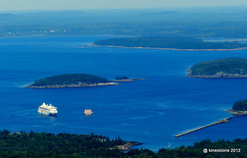 Two days later we happened to be at the top of Cadillac Mountain when the Margaret Todd was leaving on the afternoon cruise, passing in front of one of the cruise ships in the harbor.